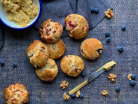 Raspberry and Blueberry Scones with Walnut and Honey Butter